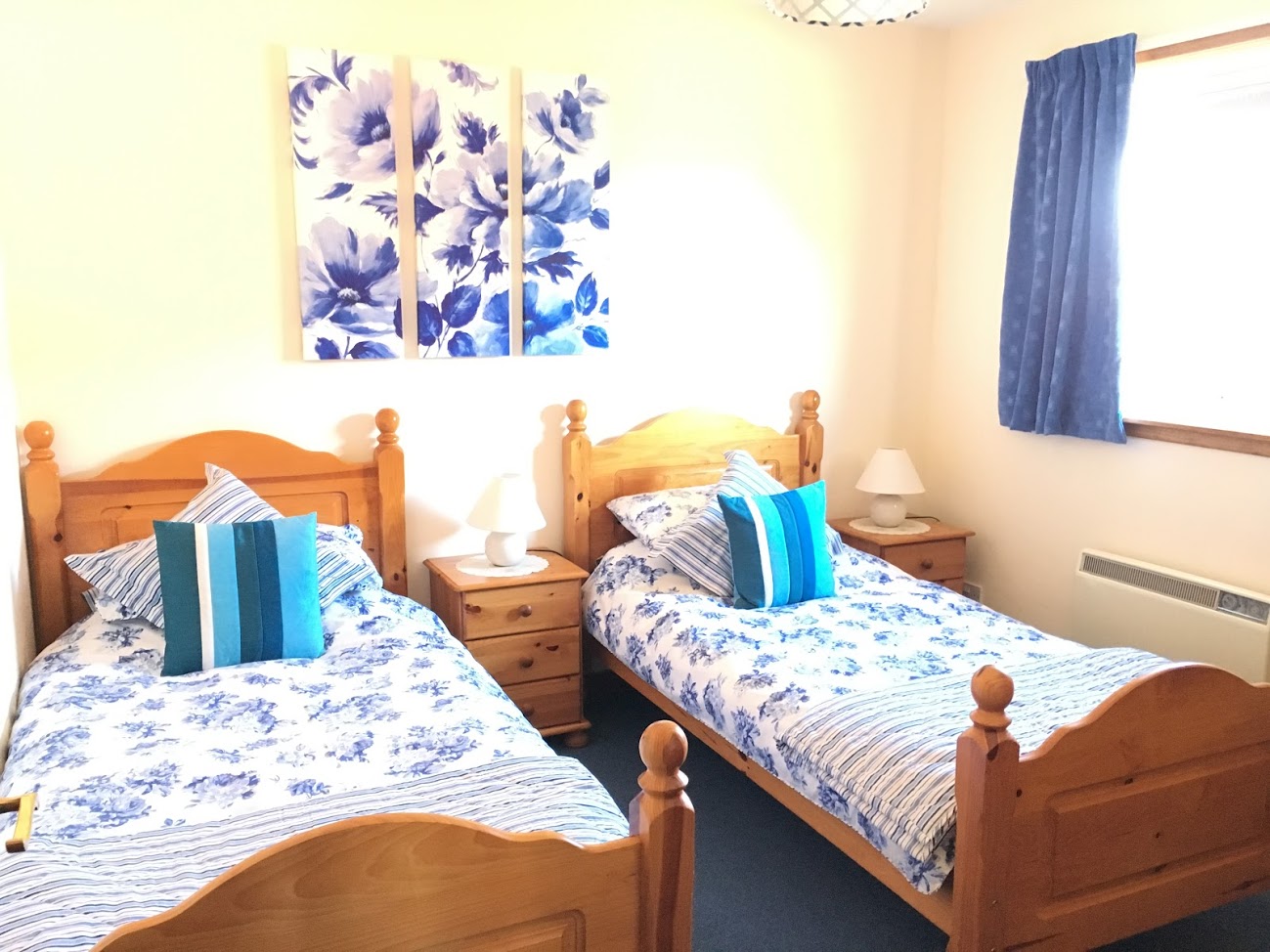 Solid pine twin beds with matching bedside cabinets, double wardrobe and three draw unit